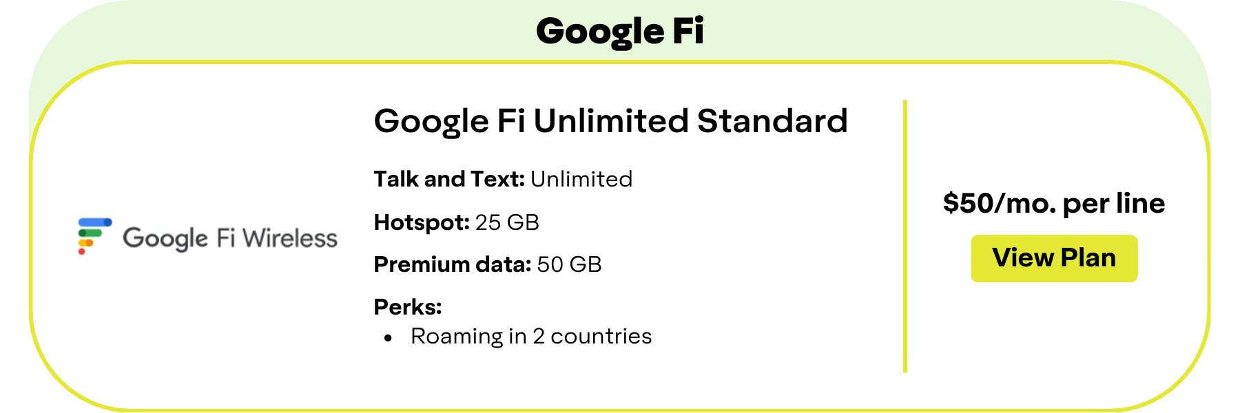Google Fi’s Unlimited Standard plan offers solid value, especially for Android users. It also includes features like hotspot data and international usability.