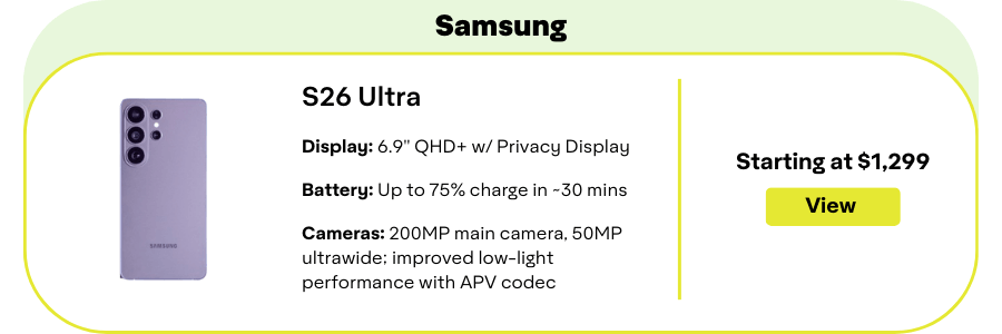 Samsung’s current U.S. pricing starts at $899.99 for the Galaxy S26, $1,099.99 for the Galaxy S26+, and $1,299.99 for the Galaxy S26 Ultra. Prices go up with more storage, but trade-ins, carrier promos, and Samsung financing can bring your actual cost down.