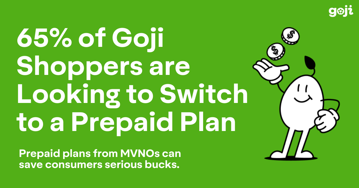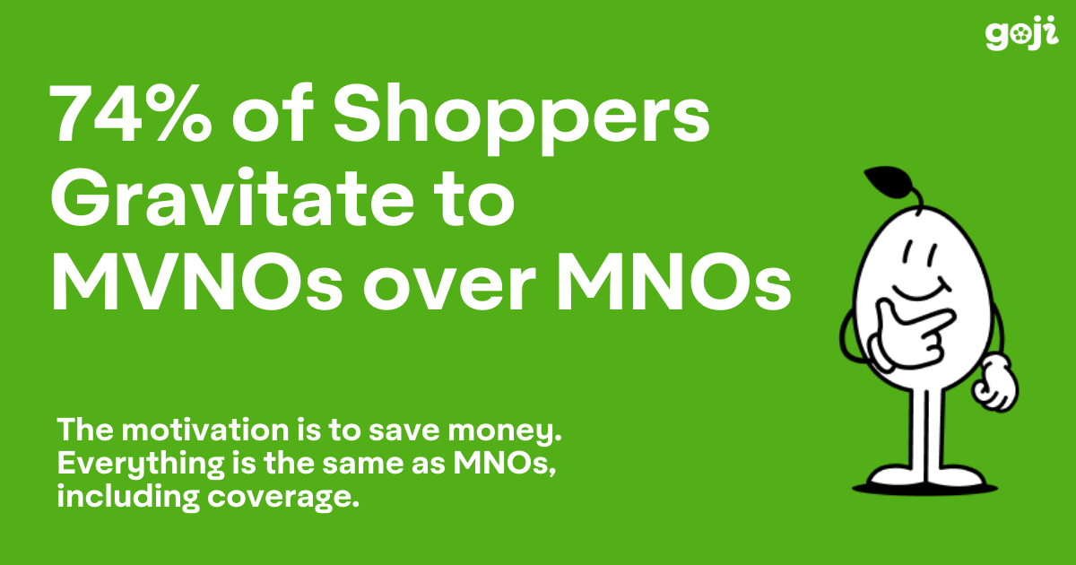 Goji Mobile data shows that 74% of phone plan shoppers gravitate to MVNOs over MNOs like Verizon and AT&T. More than 100 wireless carriers are represented in Goji’s marketplace.