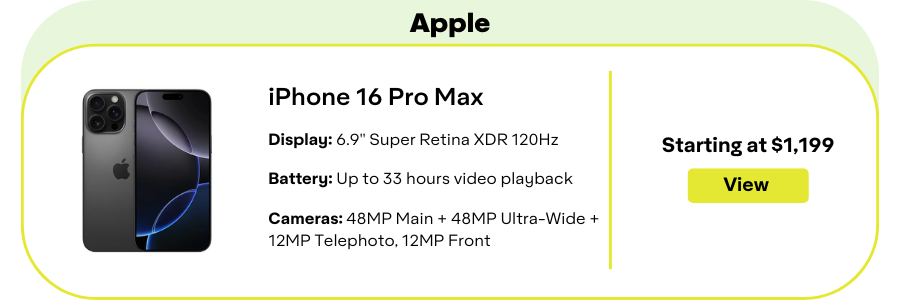iPhone 16 Pro Max keeps it tight with a 48 MP main, a 48 MP ultrawide, and a long-reach periscope, plus a pro video toolkit that means business.